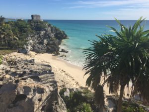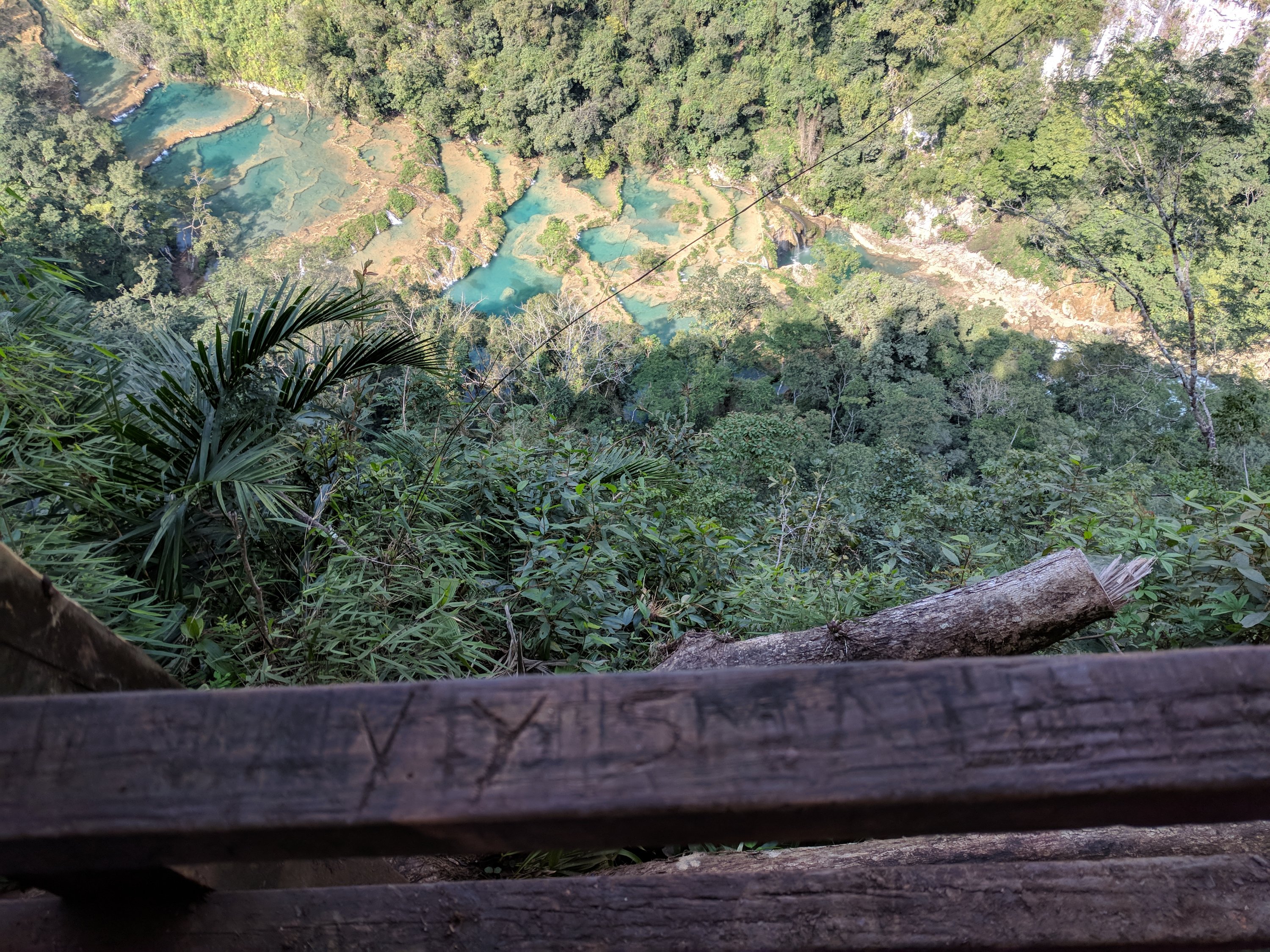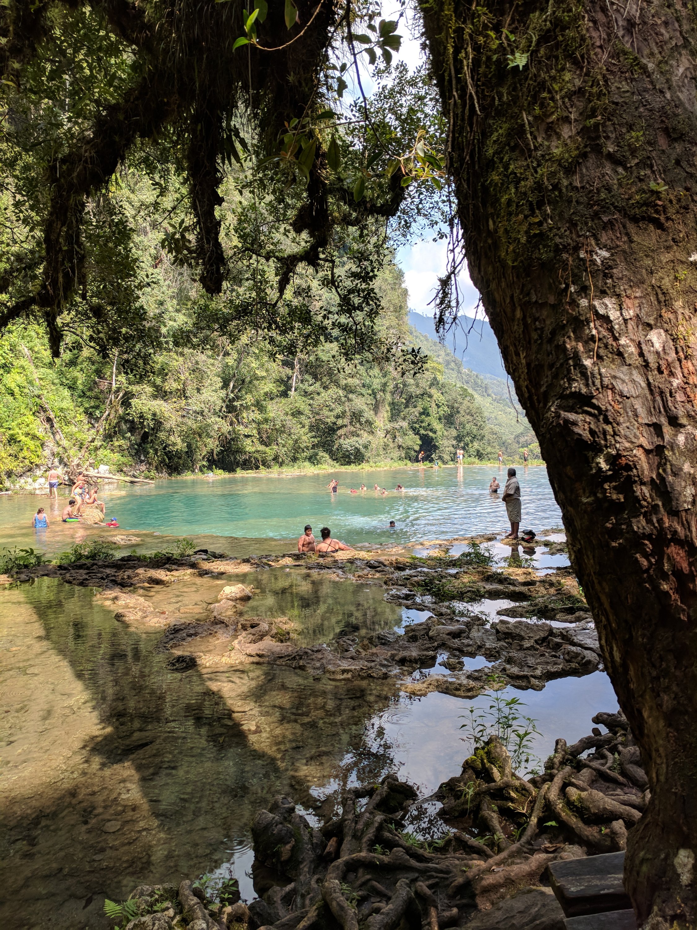 Now in the Coban area in the highlands, we visit the beautiful mountain town of Lanquin and the natural limestone pools in Semuc Champey. The roads become so steep and narrow ,that we also take a collectivo, small 4×4 trucks where you stand on the back in a metal cage to hold on for dear life.But what a reward , natural swimming pools and waterfalls along a deeply cut gorge.