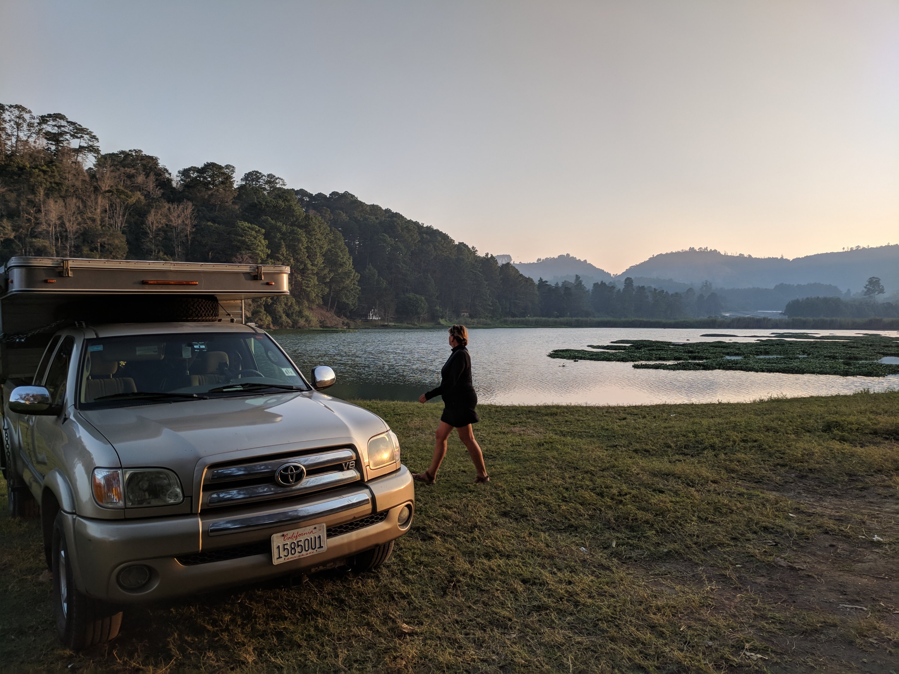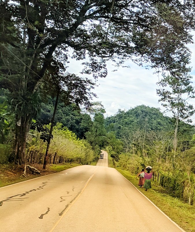 When I opened the Velcro window I see a cow walking close by and feel relieved. While people are mostly friendly and welcoming , I do feel a bit on the edge,if we are not sleeping in a secured parking area. The difference between rich and poor is just so extreme here that the historical social unrest seems deeply embedded in Guatemala.Just that evening we talked to Udo from Germany who drove by in his Porsche with his wife ,originally from San Christobal where they still own a hotel. In Coban we walked through the glizzy mall ,just like in the bay area. While 10 minutes outside town , Mayan families live of a few dollars a day . Women with water, vegetable bags or laundry walk alongside the steep roads. Man and boys walk with large bundles of wood on the back and a rope arround the forehead to help with the head to balance the heavy load. The veggies, live chickens and fruit,needs to be brought to the village on market days,and small pickups are filled with people and goods.
